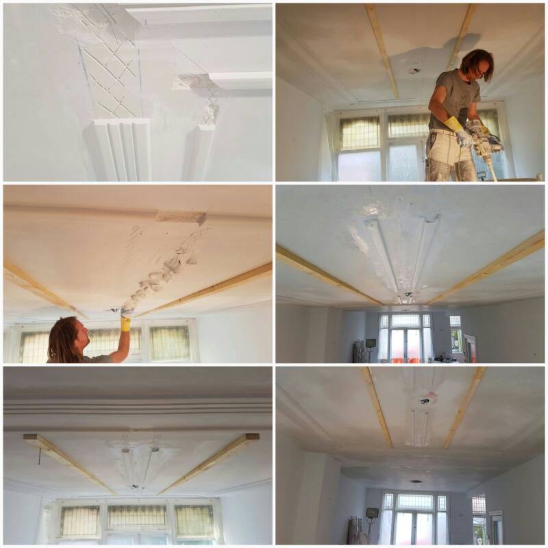 Onze specialiteit is het restaureren van oude plafonds. Zelfs wanneer een bestaand plafond met ornamenten en lijstwerk naar beneden dreigt te komen is dit nog te herstellen. Met behulp van mallen kunnen verloren stukken lijsten of ornamenten gekopieerd worden en in oude staat worden teruggebracht.